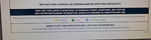 Read moreI live locally and kept promising my daughter next time she's over to go to Jonny's for Lunch. We ordered a BLT on Granary and a Cheesy one Burger plus small fries to share and an Americano coffee. Good Service with the order but when arrived the BLT turned up on 'Soft white Bloomer? The young waiter offered to do another one, but I thought they would just take the contents out and put it in Granary, so except it. The food was good but surprised at the £4.75 for what is a very small bucket of chips. Then at the till the Bill was a bit more than expected due to a 10% service charge. I looked at the menu back at home which states...An optional 10% service charge will be automatically added to the bill. If it's optional then it shouldn't be automatic and it should be pointed out at point of paying. Like a mug I had also left a tip. Just leaves a sour taste. So in total £35 for the above and tip. Bloody expensive Lunch for...