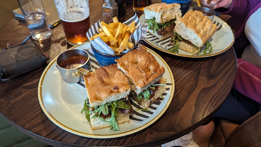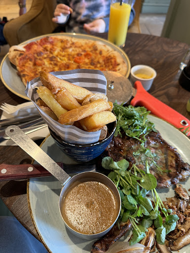 Read moreVisited for a family meal while staying just outside of Broadway. The restaurant has a main bar area to the front which is dog friendly (not my cup of tea) but with a restaurant section to the rear where pets are not allowed. We sat at the rear and were greeted by a traditional low beamed ceilinged room featuring a very welcoming real fire that added to the cosy feel of the place. We ordered mixed breads and olives to start with a round of drinks. These were served nice and quickly and we were allowed plenty of time to enjoy them before they were cleared away and our mains brought. We had a varied mix of meals for mains between us. I had the half rotisserie chicken with fries, my wife had the three cheese and mushroom pizza. Our eldest had the ribeye steak and our youngest had the dirty burger. The chicken I had was absolutely lovely, it was served with a honey glaze, a gravy type sauce and really nice fries. The steak was ordered medium and was cooked perfectly, this came with chunky chips and an excellent peppercorn sauce. The dirty burger was also really good with the smashed patties and brisket topping all being very good. My wife's pizza was excellent with a goodly amount of toppings and a very nice crispy base. We had a mix of wines, beers and soft drinks throughout the meal all of which were served really well. The staff were lovely and friendly and the restaurant was nice and clean.