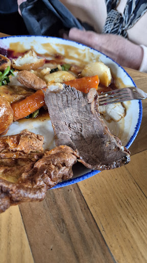 Now, let's talk about the food. We had the pleasure of trying a variety of dishes that left our taste buds dancing with delight. The highlight of our meal was undoubtedly the Sunday roast. The beautifully cooked roast with its succulent and tender beef, accompanied by perfectly roasted potatoes and an array of well-seasoned vegetables, was an absolute treat. It was a true testament to the skill of the kitchen, and we couldn't have been happier with our choices.