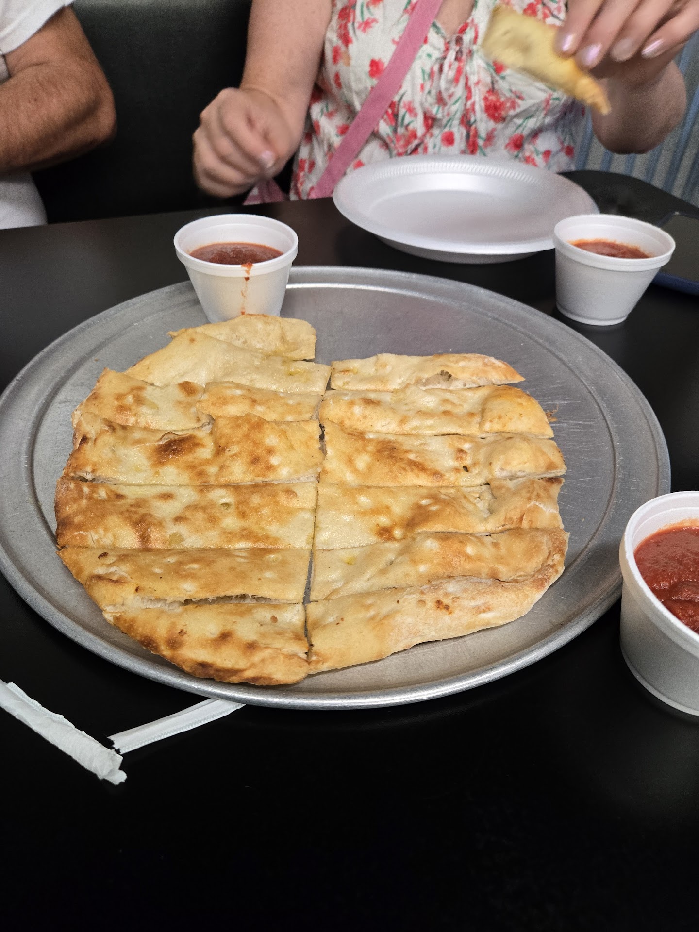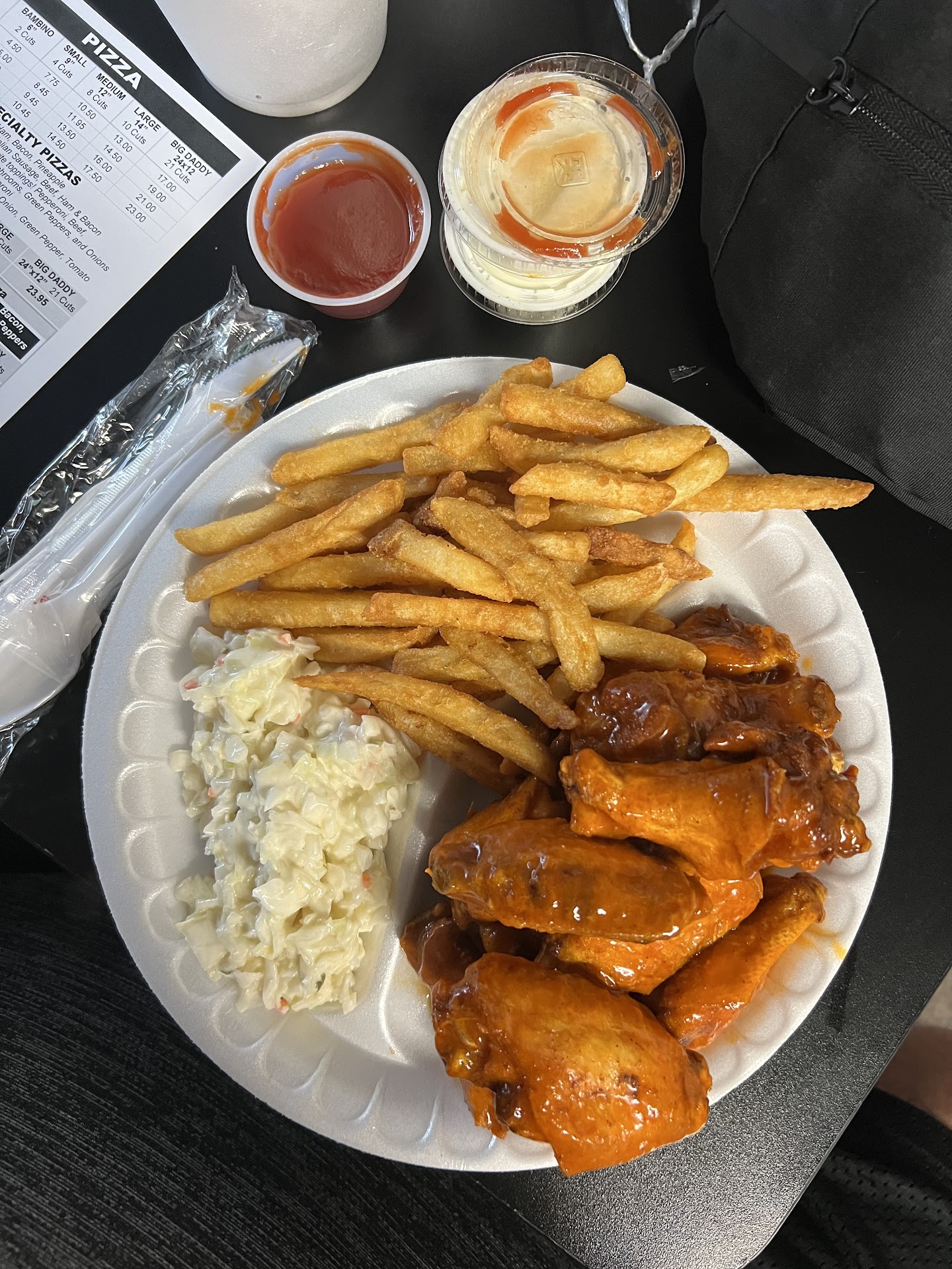 There were four of us dinning. One friend had the loaded baked potato, one had the chicken salad. My wife had a Stromboli and I had the wings fries and coleslaw. Every one enjoyed the food they had. I liked my wings thought the fries could've been more crispy and cooked longer but that's my preference doesn't mean they weren't tasty. The Cole slaw is good! It's a small place with about seating for 15 to 20 people. There is free parking on the street. They do take out orders although we dined in. We didn't order pizza but over heard several guests speaking highly of it. The staff were friendly and the young lady working the register was a great representation of a friendly face that made us feel welcomed. We would return and plan to return there during this visit...