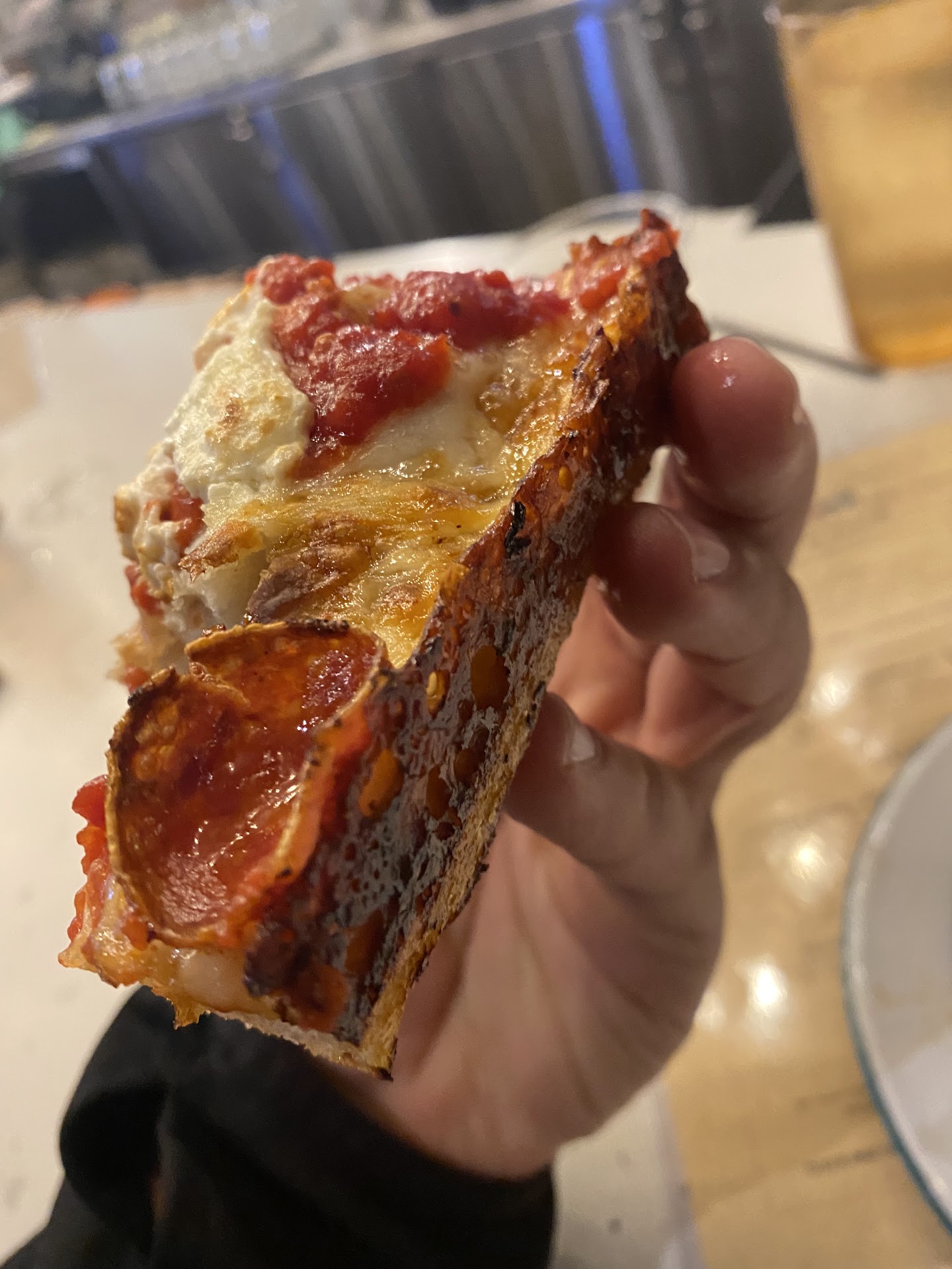 Read moreI REALLY wanted to like this place because we had been in the area a year ago and were not able to get in--apparently you need reservations FYI. I really like the theme of the place, super cool, but the prices are outrageous. $30 for a pizza?! Also the pizza pricing is unclear on menu--the left side is the list of pizzas they created and on the right is build you own. Above it shows Detroit style or grandma style--so it looks like you are supposed to select the style crust (det or gram) and then either the named pizzas or the BYO. We ordered a classic ($20) plus ricotta ($3) and asked for it grandma style. They charged us $29 for the pizza. If it is more for the different styles then make that clear on your menu. The pizza came out seconds after it came out of the oven so it was a hot mess trying to cut it because they did not properly cut it. I couldn't imagine it having more toppings than what we had because everything just fell off when you cut it. They don't give you a pizza spatula or anything-- just a butter knife and forks. Then they put it on this wobbly tray/stool so cutting was a disaster-had to stand up every time we wanted to get a slice and it was the messiest pizza ever--not pizza you want to eat in public. Let pizzas chill back there for a few so its actually edible when it gets to the table. Also for a place that boasts about their 6 hour sauce--there was NONE on our pizza it was just overloaded with mozzarella that is a little too salty, especially with little to no sauce. Out of many beers on their menu, but they are still listed on the board. Overall a pretty bad experience that was...