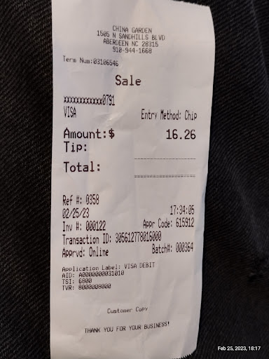 Read moreThis place has quickly become my favorite Chinese restaurant for price, quality of food, and friendliness of the owners. Winnie and her husband are so sweet and courteous and I have grown to know them just by chatting with them over several years of coming for takeout from their buffet which is always fresh when I have gone (usually on a Friday after work if I happen to be in town but I have also driven to Aberdeen on a Saturday just to eat in with family or get takeout). I don't live in Aberdeen but I will drive an hour to come to this place. The Chinese places closer to where I live weigh the takeout from the buffet (as does this one) but their prices per pound are exorbitant compared to China Garden. Take Peking Wok in Rockingham for instance: if you get a small container of chicken and broccoli, you will be paying 12 or 13 dollars and if they think you may have added seafood to the container, some staff will actually open your box to see what you have, charge extra if you have mostly seafood and keep moving the box around on the scale until the weight shifts enough to make the price go up. I have never seen anyone at China Garden look in my takeout box. I can comfortably get what I want and not be under suspicion that I might be coming to load up boxes with only expensive items. I can spend twenty bucks and feed 3 people and have some left for the next day. Plus, the owners and other staff stay on top of the buffet making sure that it is clean and that the food doesn't run out. I have been to Peking Wok in Rockingham (as well as other places) where you stand around waiting with your empty box or plate waiting for food items to come out while the staff stares at you with derision. If you could read their minds they'd probably be calling us gluttonous pigs and laughing inside. I don't like feeling unwelcome or having to run for the food when it finally comes out. China Garden. Friendly, respectful...