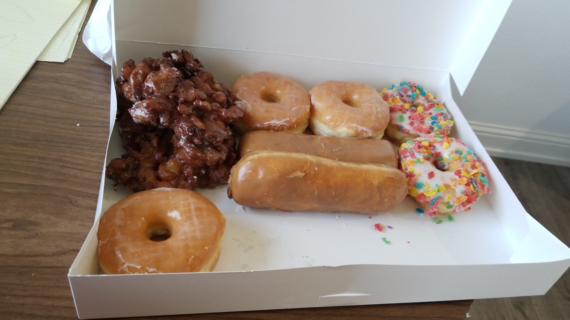 But wait, there's more! The box also included a dozen donut holes, those perfect little bites of sugary goodness that melt in your mouth. And then came the fritters. Two golden brown apple fritters, bursting with juicy apple chunks and cinnamon spice, and a blueberry fritter that was a symphony of sweet and tart flavors.