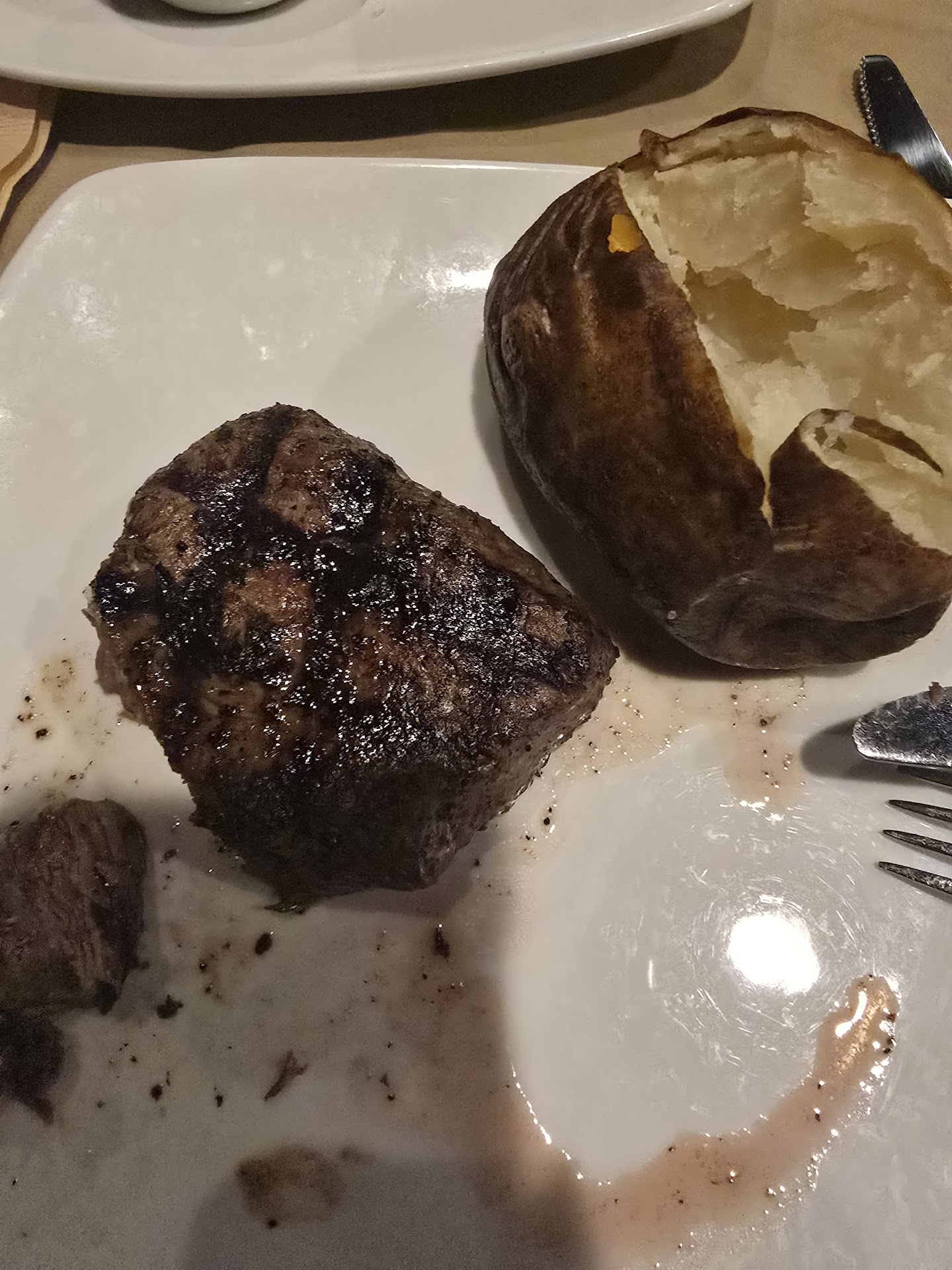 The menu at the Beehive is similar to that of a regular steakhouse. The drinks were average, but with some additional bartending training, they have the potential to improve. We ordered a ribeye and a filet with baked potatoes and salad. The Caesar and house salads lacked both presentation and flavor. The steaks were cooked correctly, but they were also lacking in flavor.