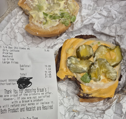 Read moreWe went to Braum’s, a new restaurant in Abilene Tx. We were excited because we have frequented the Braum’s in the Dallas area, and we finally got one in Abilene. Needless to say, at 8:30 pm, they were crowded, so we went through the drive thru, we were in the drive thru for 30 minutes, because of the line. Remember, Dallas Braum’s are worth the wait. We finally go to the window, we order a bag of burgers and a number 5 combo (bacon cheese burger). We paid extra for the bag of burgers to be “deluxe” ($6.70 to $13.00) and upsized th combo to large for an extra $4. The combo was supposed to have large fries, the were medium at best, and looked like they were the bottom of the barrel, crumbs, and very salty. The milkshake wasn’t mixed well, and you couldn’t suck it with a straw, and it had a hold in the cup. Apparently, the mixer knicked the side of the styrofoam cup, and it had remnants of styrofoam the shake. One of the burger buns was burnt . For an almost $30 bill, the experience was less than mediocre. We...