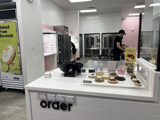 As for service and and atmosphere- branding was cute, store looked clean but there was little to no involvement or interaction with staff. Perhaps I am too used to home/other bakeries - you go in, there is a kiosk, if you don't wish to use it they can help you order if you ask or people order ahead. Then you just stand there and wait for your name. They show you the cookies and if they are right off ya go. Just seemed very... sterile. Odd for there being like 5 girls working whom were in very clear view and being observed by all...