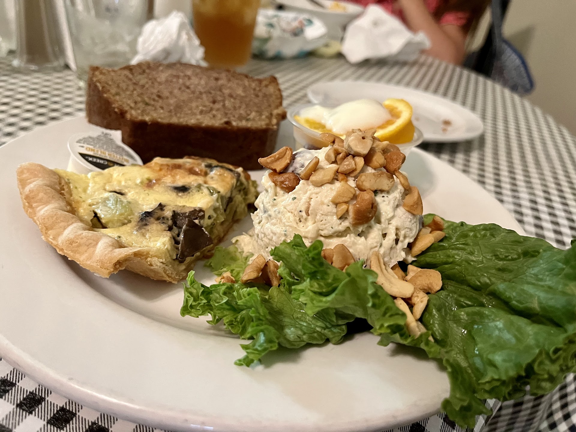 Read moreThis is such a great lunch spot! Went with a friend, and we both ordered the same thing. The Salad Sampler with Maple Vinaigrette. It came with their very popular chicken salad, a pasta salad with chicken, and a garden salad. It also came with 2 pieces of zucchini bread. I liked the pasta salad with chicken. It was tangy, and the chicken had good texture but not really any flavor. The chicken salad was a flavor bomb in your mouth! Wow! Awesome flavor. BUT I got WAY too many fatty, rubbery, grisly pieces to be able to thoroughly enjoy it, which was a bummer. But I did eat the pieces that I could tell would have a good texture. I ordered their vegetable of the day quiche, to go, which was a broccoli mushroom. It was delicious! I also ordered a bowl of broccoli parmesan soup to go and did not like the texture of this soup at all, but the flavor was very good! It was goopy. Reminded me of paper mache glue. The raspberry iced tea was very good. It's not too sweet, very refreshing. I will go back because it's a nice spot for lunch. But I will definitely try other things or maybe stick...