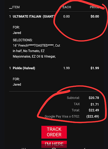 After placing an order a day head there was system glitch that showed sandwich was $0.00, and the pickle was the only thing being charged. Even after totaling before check out it showed $2 something for the pickle. After I made my purchase it jumped to $22 from my reciept.
