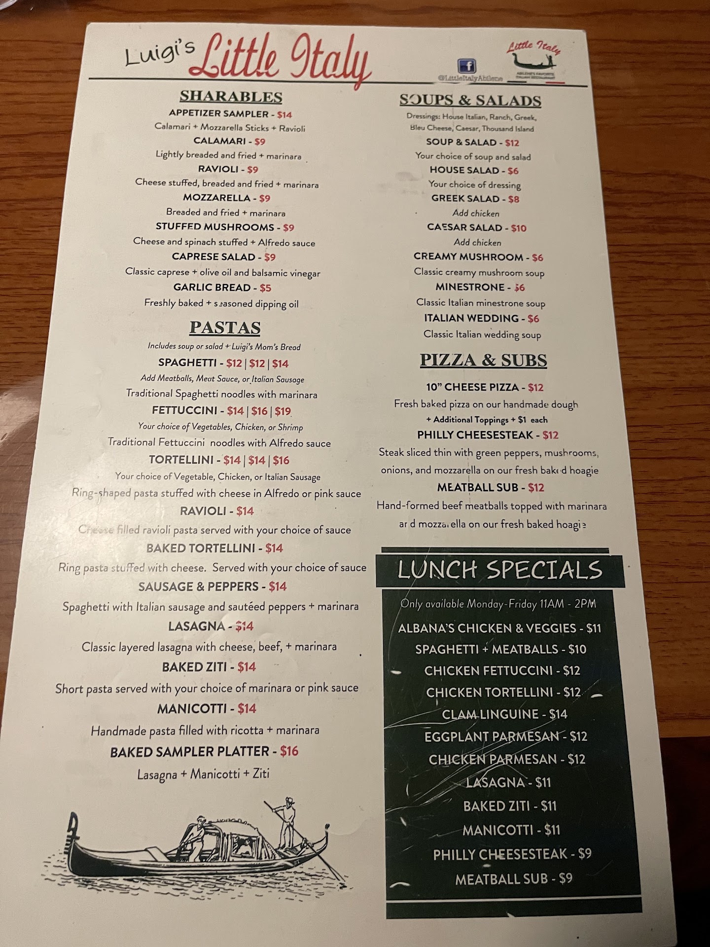 Read moreMy husband and I were looking for a sit down dinner open on a Sunday afternoon in Abilene on our long trip home. Italian food is our favorite and Little Italy's did not disappoint. We had the Caprese appetizer. The mozzarella was seasoned well. There could have been more basil and less spinach, but it was good. I had the Veal Cremora, with the mushrooms and Brandy cream sauce. The sauce was under seasoned but a few shakes of salt and pepper brought the meal into proper balance. The veal was slightly overcooked for my personal preference but it was not tough. I would order it again. My husband ordered the Baked Pasta Sampler. The marinara sauce was fresh and light, but also under seasoned. We noticed the manicotti and the ziti were handmade and well prepared. Both dishes came with salad. My husband chose the house dressing, a tomato basil vinaigrette which he really liked. I ordered the Greek salad, which came with an upcharge. The atmosphere was pleasant, family friendly but romantic. Our server was cheerful, checked on us frequently, and did the business proud by suggesting we order dessert to go. We will have to return for some cannolis and limoncello cake. Overall, we had a good experience and will likely return when we pass through...