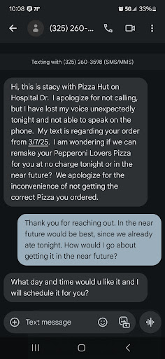 Ā Ā Ā Read moreUpdate I talked to Dani today with Pizza Hut and he did an amazing job of taking care of the situation, and restored my faith in the company as a whole!! He was amazing!!!