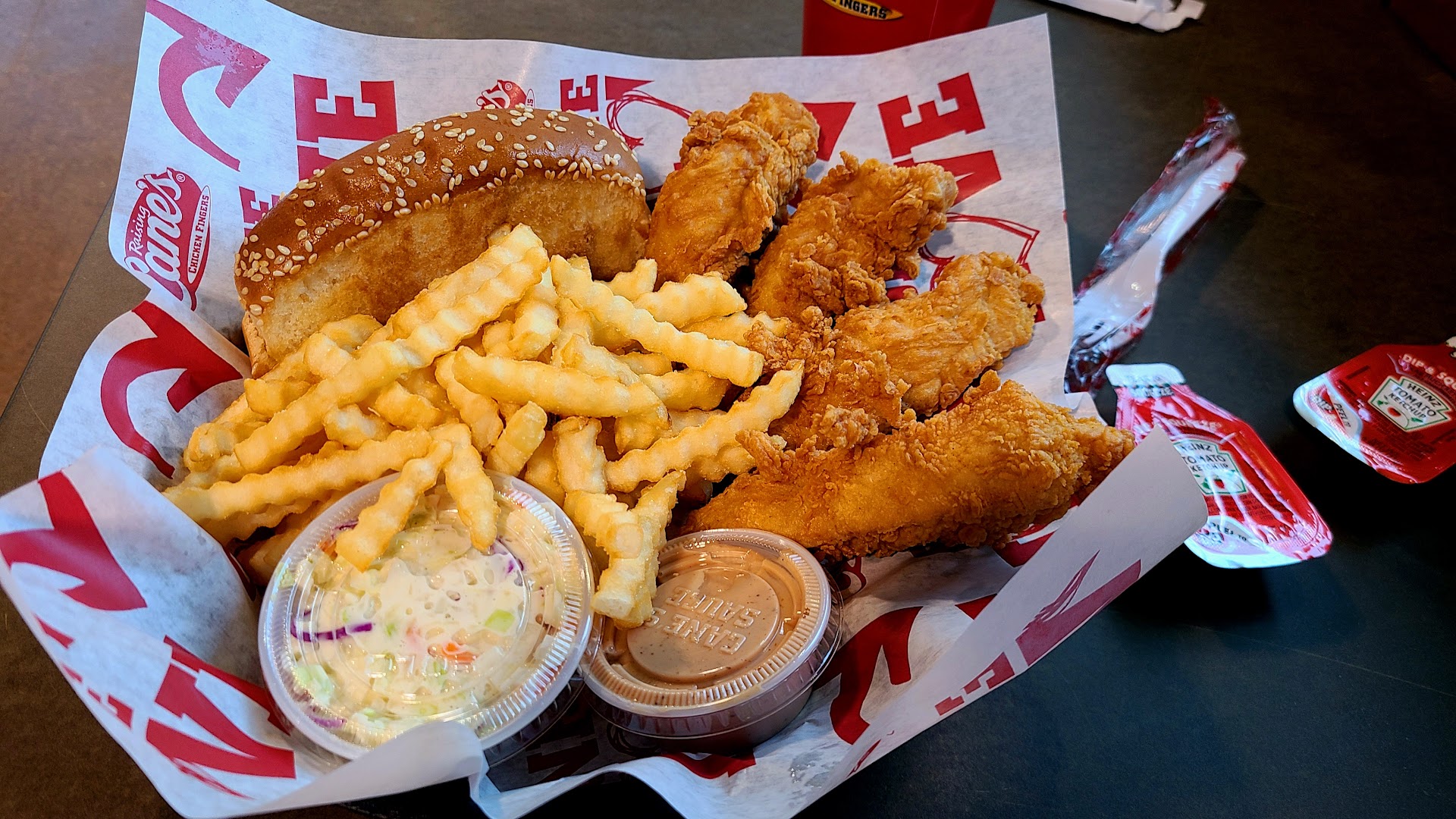 The Box Combo 4 Chicken Strips, crinkle fries, one Cane's sauce, Texas toast, coleslaw, regular drink/tea. $9.69 +tax Good chicken strips, hot and fresh. They must have just taken them out of the fryer. I love their Cane sauce, but really you can give at least two when a person gets the combo meal of 4 or more. There is not enough for four tenders!! Then to make people pay for extras! I just paid $10.49 for a four strip combo. I can spend this same thing at Chick-fil-A for a 12 piece and get a healthy side of a salad or fruit with one of their famous 🍋 lemonades plus they will give me all the sauce I ask for. Fries not hot and fresh. I got one out of bag to enjoy while it was still nice and hot 🔥 on the drive home. 😶 They were limp, cold, under cooked, and pretty much nasty!! The Texas toast was not toast. It was dried out bread with some grease/butter (what ever is in that thing they use to apply the fat to the bread) on it. It didn't even look like it was ever on the flat top. More like it had been in an air fryer for a couple minutes till it was just dry, but not toasted and brown. The coleslaw was actually good. Crisp, cold, great flavor and not to much...