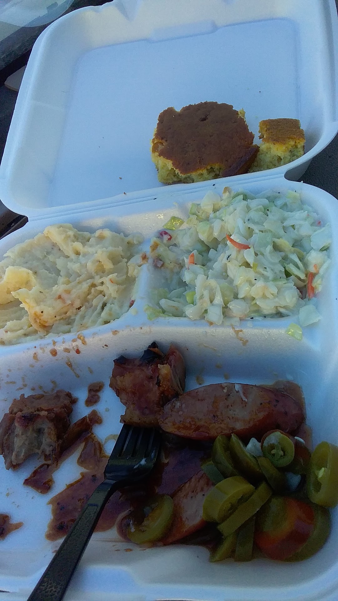 Garbage. Paid nearly $30 for a 5 meat plate and a large coke. The lady taking our order did not know how to operate the headset and asked us to pull forward. When she finally came to the window we were informed they are out of two of the meats we selected, ribs and turkey. We said we did not need a receipt which she handed to us anyways in lieu of keeping our debit card. 10 minutes later as people are coming and going she comes out and states they are out of another one of our selected meats; chicken, after we already paid. When I asked for a refund she ignores me and said they are already almost done building our plate. So we opted for double sausage. In the end out of the 6 to 7 meats they offer, 3 were available so we had to double up. Another ten minutes go buy as people come and go and they bring us our food. When I called them to address the issues there was nothing but disdain on the other line and was told that the chicken that we ordered was taken by another customer after we had already placed our order. Not sure how that works. When we got home and checked the food there were very small portions of the three meats they had available, which is why we specifically attempt a variety because they skimp you on so called doubles of a specific meat on one plate, while offering more for the same price with if they are different selections. All in all brisket was dry, gristly and tough, incompetent and rude employees, skimpy servings for the price so I guess they are pretty proud of their stuff, out of multiple menu items regularly. Done...