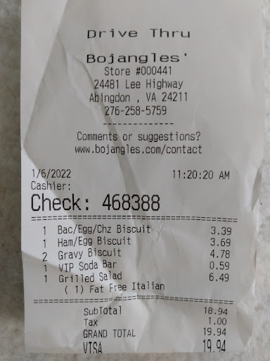 Read moreThis used to be a five star Bojangles and my former review said so. But after my most recent visit it is now terrible. Most reviews are just one or two stars and share the same complaints. How can the reviews possibly be 3.8 average because nobody is giving them three stars??? Dining room is closed and doors are locked. We ordered two meals at the drive thru. Ordered a breast and a wing. What we received was a thigh and a leg which is dark meat. I drove back from my house to get it changed and my wife called them to explain what we wanted and that I was returning to the restaurant. They wanted to argue about it at the drive thru. Seriously?? They didn't open the door to deal with it in the lobby. So I got back in the drive through and waited at the window until they finally, finally got it right. This was very embarrassing because the person working the drive through was very "flip" about it. The employees were laughing and made me mad. Meanwhile, my wife was at home with the other chicken dinner getting cold. I don't plan to ever return to the Abingdon Bojangles but the Bojangles at exit 7 is very good and a totally different experience. The Bristol store does a much better job, despite that they have an undesirable location and a chic-fil-a right around the corner to compete with. Abingdon should be ashamed of the poor performance, bad reviews, and they are located in a very high traffic location and right in front of Walmart. Hey Y'all- Team work makes the dream work, get your act together or you will be just like the Bojangles in Marion.......failed,...