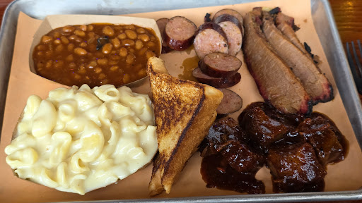 I had the 3 meat platter with jalapeno sausage, brisket, and burnt ends. Along with mac & cheese and bbq baked beans for sides. The sausage was tasty, good flavor with light smoke. The brisket tasted ok but my flat slices were a bit dry, unfortunately. Burnt ends are a craft and there are many different interpretations on how to serve them. With that said, these weren't my favorite rendition. They weren't bad at all, don't misread! The mac & cheese were nice and gooey, the bbq baked beans had some spice and lots of flavor.