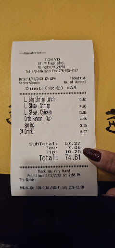 Read moreFood is overpriced as is on the menu. You get your receipt and everything you order is at best 5 dollars more than menu price one or 2 dinners were atleast 10 dollars off menu price. We were 3 adults 1 toddler, gave My son a kids sized drink but charged for an adult drink. Everything on the receipt was not the price on the menu. Even then though we added it up and even with the misleading prices on the receipt it added up to around 65 so tell me how the total was 94 🤣 waitress was awesome but when you're adding up food to make sure you can cover the bill and still tip and 30 dollars gets added on to your already incorrect priced receipt. Food was okay at best definitely not even close to one of the best Japanese restraunts ive been to and every single one of those were extremely cheaper than this place with mediocre food at best....