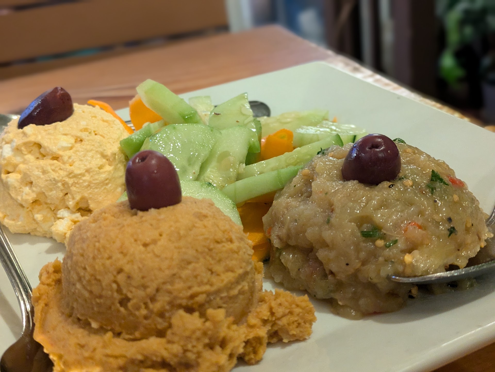 We started with some dips and pita as an appetizer. Not the best tzatziki, hummus, whipped feta, and melitzanosalata you'll ever try. They're all a bit firm and served as scoops with an olive on top. It looks like breasts...maybe that's on purpose to make it feel "maternal"? Who knows? But it's fresh and flavorful. Perfect for nibbling while you sip wine and chat with companions. It's BYOB, so bring your own bottle.