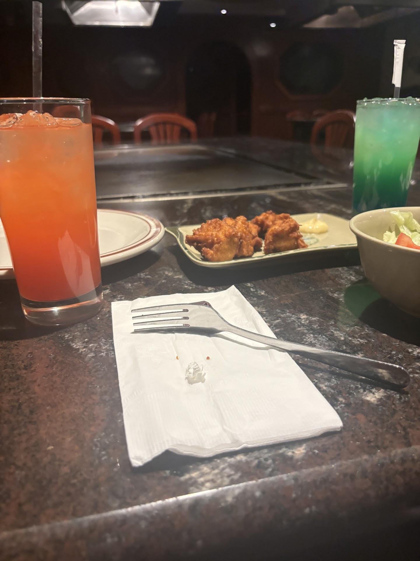 Read moreNot gonna lie, it felt a little dungeon-y. But in a good way. Like it felt like the setting for some really good japanese food as well as the perfect date night setting. We went on a sunday at 6pm. We were lucky enough to get sat at our own table with our own chef . Usually parties smaller than 8 would have to share a chef. So this felt perfect for our 2 year anniversary. The wait staff was fantastic and the chef was very professional. They made us feel like we were at home. We had the Japanese fried chicken, octopus balls, steak/scallops, and salmon/shrimp. All tasted fantastic. The octopus blew me away because i didn’t know what to expect. It was probably the best taste appetizer. Don’t let the name put you off. Youll want these in your mouth, no diddy. To drink, we had the hibachi cooler and south beach. The south beach was better but both were good. Overall fantastic experience. Parking was free as they’re located in a shopping center and the location is easy to find. They have ample parking at the front and back of building. Although the back was where the actual front door is. Will definitely go again with a bigger group of friends!