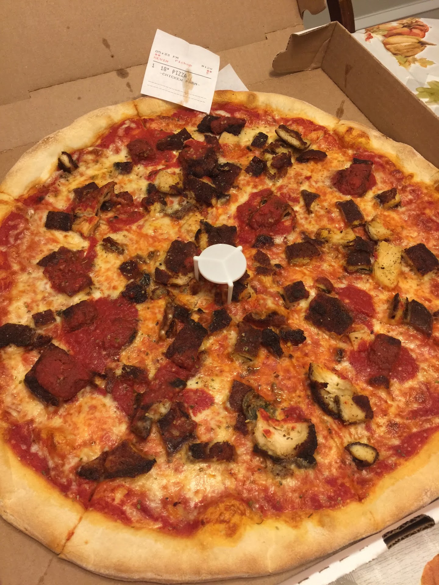 After I got home at 6:48pm I resignedly sat down to warm my frozen body with my hard won pizza. Except the Chicken parm pizza, very extremely obviously, had terribly burned chicken. They are in the image attached. I thought that perhaps they were just slightly burned and that it was a darker seasoning. I took a small piece and confirmed that it did indeed taste like ashes in my mouth, which was a fair metaphor for the entire experience until this point. I called and asked if they could please prepare another pizza of the same type to replace my badly burnt pizza. The young woman I spoke with was very helpful, and offered a $10 coupon for my next purchase. I explained that I wouldn't be able to eat my current pizza, and why. She had to put me on hold once more, but agreed they would be able to make a replacement pizza. I returned to the store.