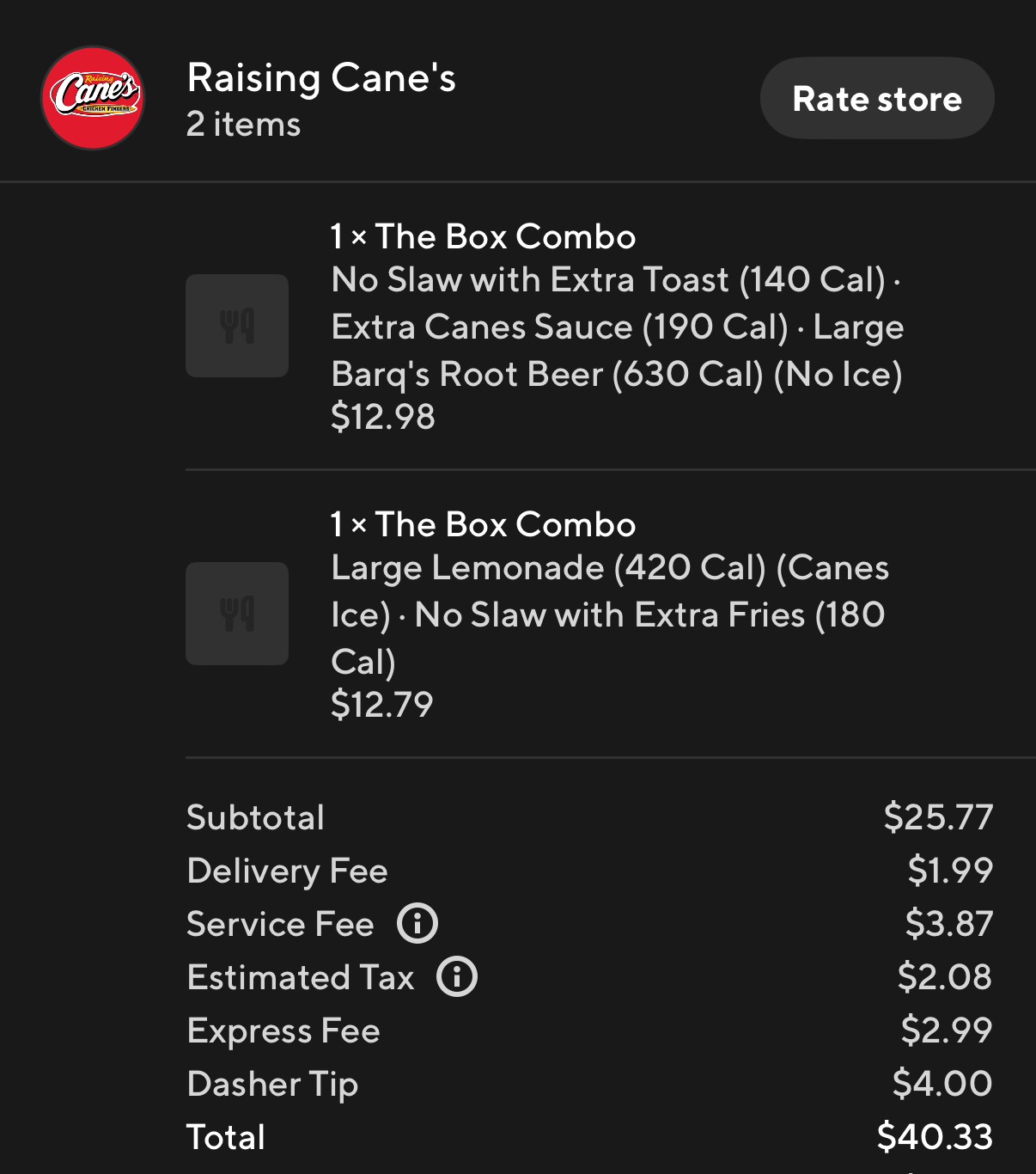 Simple order: Caniac Combo, substitute slaw for the toast and the drink was half unsweetened tea & half lemonade. For those not familiar with R.C., this is a completely normal order and these options are on the regular menu. Nothing in this order was special or unique to me.