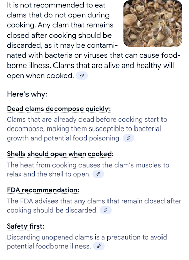 Yesterday, I was excited to try their clam special. Out of about 15 clams served, five of them were unopened. As anyone familiar with seafood preparation knows, an unopened clam after cooking is a major red flag. It generally indicates the clam was dead for some time before cooking, and the muscle has likely begun to decompose(which is why it doesn't open), posing a potential bacterial contamination risk. Reputable establishments typically discard any clams that don't open. It's not uncommon to also get a dish with maybe one or two, but 1/3 of the clams were closed.