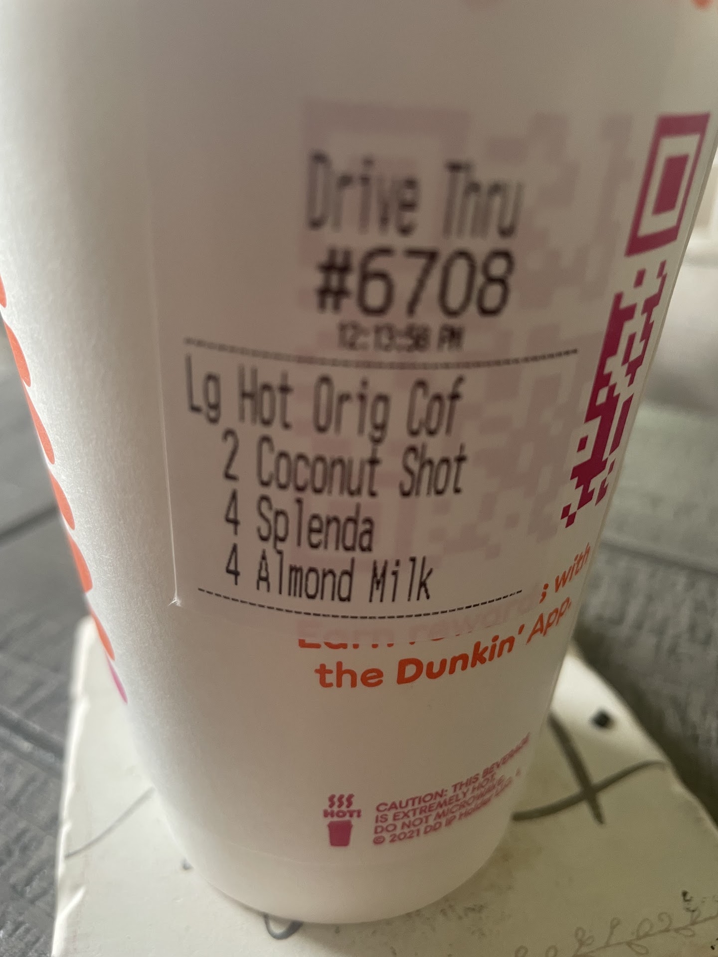 Read moreSo up until the other day, I would have given 5 stars.. But the past 4 times I have gone to this Dunkin drive-thru, they have a younger kid at the window, who usually says not 1 word to you. But recently, when pulling up to the window, he has greeted me with, "Yo."-? I was caught a little off guard and just said hi. Not once has he said, "here you go", or, "thank you", or, "you're welcome." Just leaves me with not so great memories, of this...