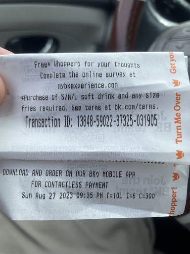 Read moreWorst experience ever!!! I ordered a whopper meal and the kids inside were playing around while I made my order, laughing through the speaker, the girl at the window did not give me a receipt, and they poured salt and pepper allllllll over my entire burger and all over the paper that wrapped my burger. It was impossible to eat because it was completely covered in like 2 pounds of salt and pepper. The manager should not allow food to be served like that to paying customers, and the kids responsibleneed to be written up. I wasted my money on that terrible food and I'm mad because I was hungry. Don't go to the burger King in Absecon around 4 pm because they will be playing around while making your food and make u waste your money because they don't make it how it's supposed to be. Idk if they thought this was a joke, but it's not funny. They could have killed someone with all that salt and pepper!!! I'll sure be calling the manager about this....