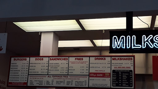 Read moreLiterally my favorite burger on the planet. Never ever had a bad experience with a Five Guys trip. My regular order is a Little Bacon Cheeseburger with A1, hot sauce, mayo & pickles the "little" cheeseburger is just one patty, while a "regular" is 2 patties. Burgers are always cooked to perfection, toppings on point. Staff is always friendly and the whole restaurant is consistently clean (including the restrooms!!). Their Cajun fries are FIRE and they usually give you a huge amount even when you order a "little" Cajun fry. They offer malt vinegar and ketchup. They also have milkshakes now too!! Always 10/10, you can't go wrong with Five Guys!! (Sorry I have no photos, I always just eat my food so quickly that I can't find a...