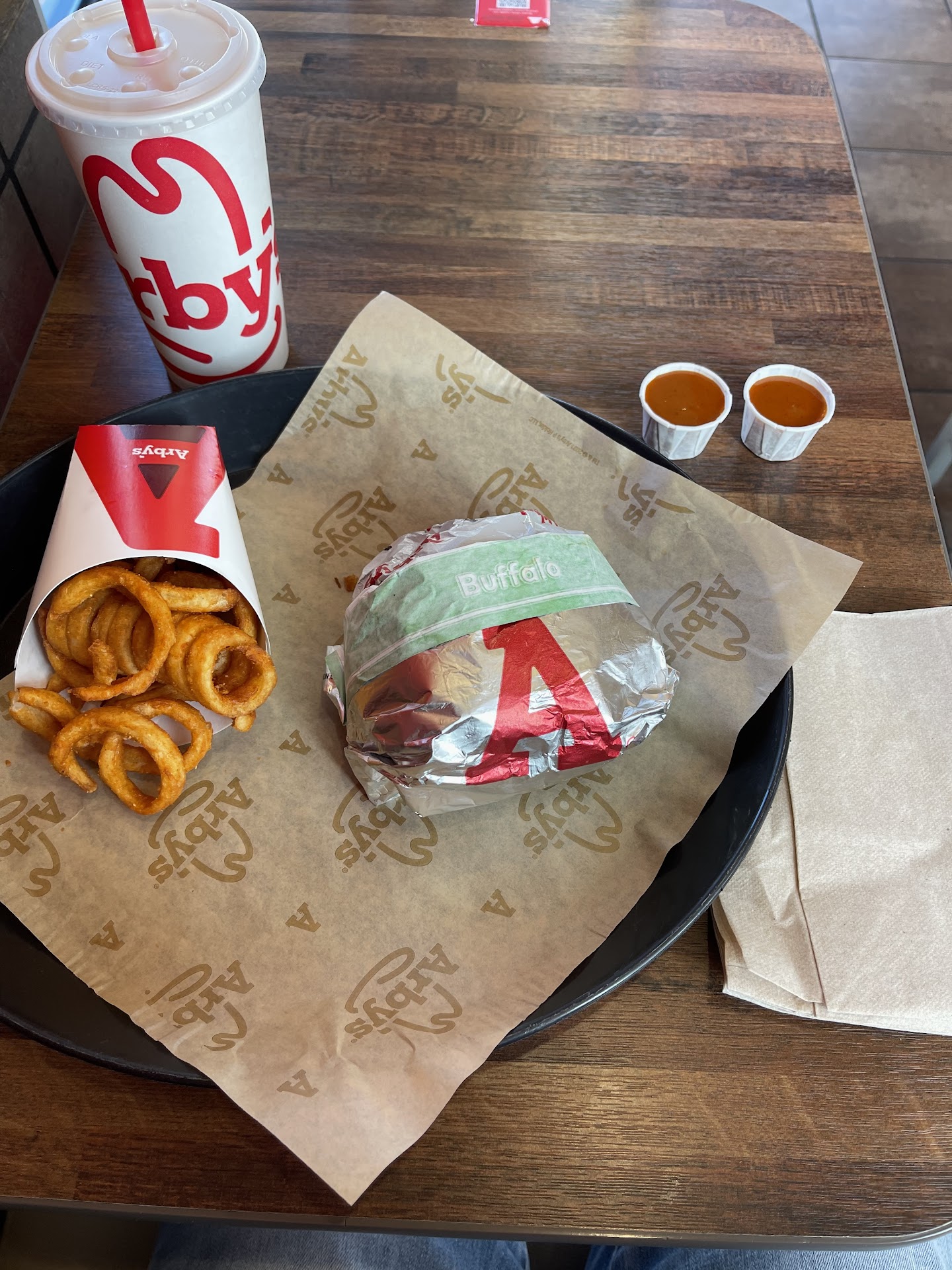 Read moreThis was my first time to see the different layout of the restaurant. I normally go to another Arby's and that want to see old style I guess. While this one seems to be under a design more streamlined. I like the new look. Now as far as service service. Fantastic. The manager Austin waited on me is long with three of his employees. Unfortunately I did not get their names. But everyone was welcoming helpful after we needed anything to quick care of us. Highly unusual for a fast food restaurant. I think I'll start coming to this one instead of my old one. Now the food we had the new burger with elk, venison and beef mixture. We love this new burger. As a matter of fact, between the three of us have visited, we ate four! I did find that I ordered the cherry sauce on the side because it was kind of overwhelming with the amount that came on the first burger. By having on the side you get really taste the quality of the meat. I also tried the fish with the hush puppy breading and it was also excellent. So overall great experience and nice looking restaurant. Extremely clean. Service top notch. Food was outstanding. So now this is my new favorite Arby's. Thanks, Austin and the crew. BTW the picture below of the burger went next to the quarter is to give you a size reference. This burger is a great size, not just a small...
