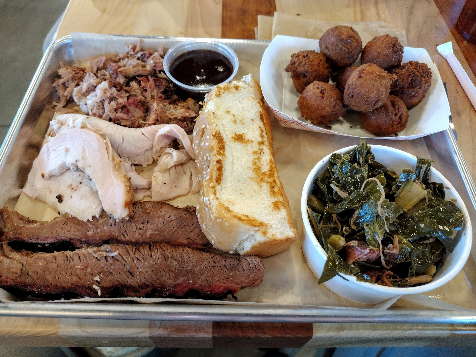Read moreOk lots to talk about with this place. Let me start by saying the food …..is great!!! In fact, so good that this was our second time there in 2 weeks. The smell as soon as you open the door and walk in makes your mouth water! I got the dirty bird which was crispy, juicy , and completely sticky and messy!! Which for the record is a good thing not a bad!! The fries were fresh and crispy and the beans with brisket side was also really good. Hush puppies were tasty and the choice of different bbq sauces to choose from are all tasty. My favorite was the sweet city and the wife liked low co. And brush fire. The banana pudding was also really good, tasted fresh and was a nice end to our dinner. Service was good. The person that took our order was friendly and the food didn’t take too terribly long considering how busy the place was. Drive thru was around the building and inside was almost full.
