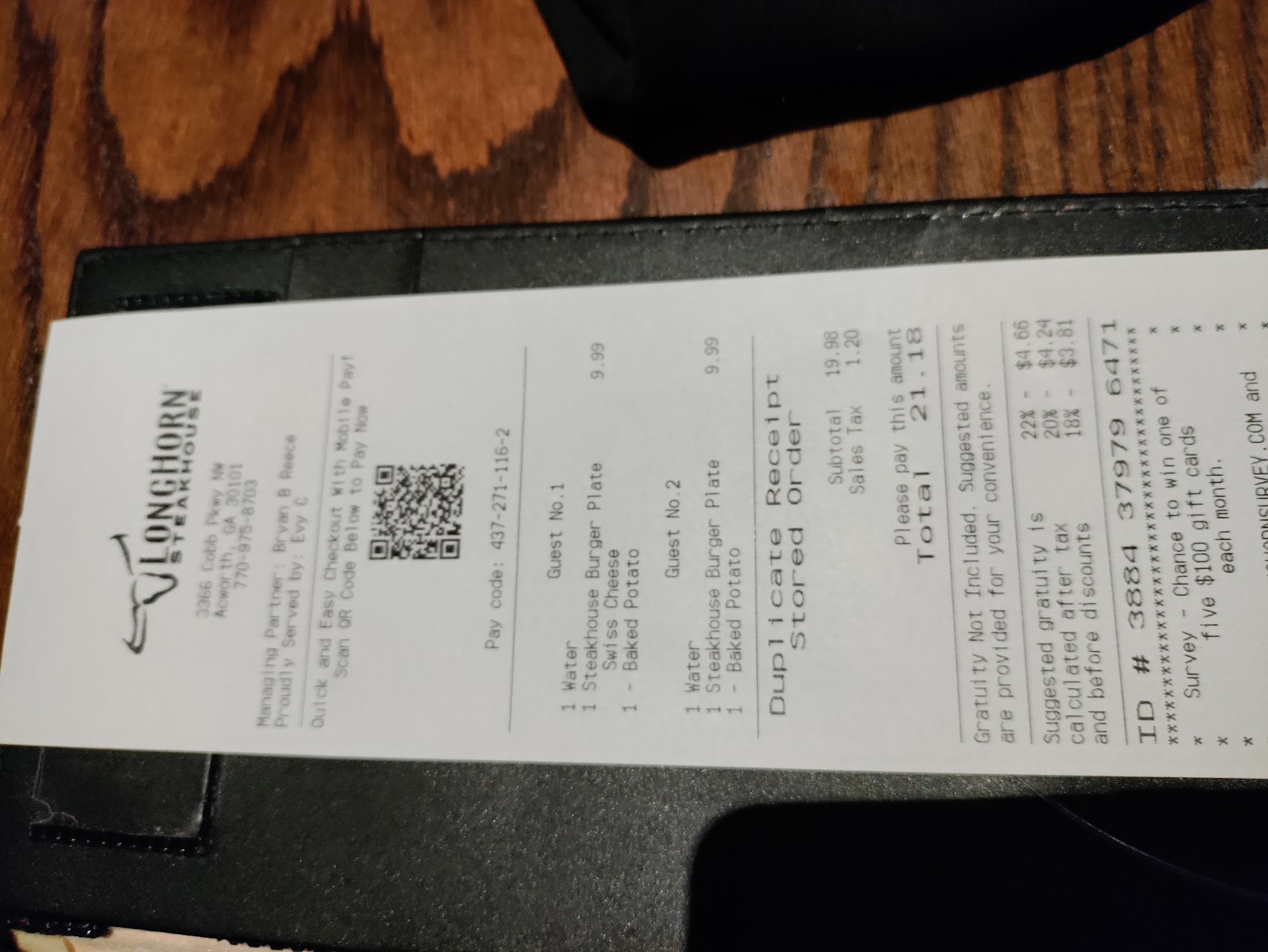 Now that we are seated the waitress comes and gets our order. 2 sodas, an appetizer, steaks with add ons and sides. 1 adjustment to the sides due to both health and religious reasons (no bacon). App came out Luke warm. Drinks took forever for refills. Steaks were burned. Shrimp was greasy. And bacon was not removed.