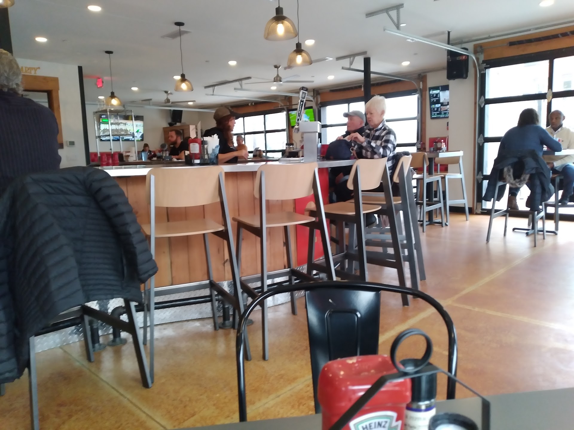 Well we had really high hopes heading in as the menu reads really well. Packed with great ingredients and lots of info on, for instance, the care put into creating a great burger grinding fresh each day with brisket etcā¦. Unfortunately we started off poorly with a solid 10 minute wait at the host stand before even being acknowledged/greetedā¦. And then another 5 before being seated( o one else waiting mins you). Place was fairly busy but had several open tables when we arrived, post lunch rush on a Monday. Understanding the current employment climate, wife and I erred on the side of patience and understanding in hopes lunch would make up for it. Service at the table was ok, albeit it inexperienced. Appetizer was acceptable, fried giant mushrooms⦠well prepared but under seasoned. Once seeing how big the mushrooms were we asked for appetizer plates so we could cut themā¦the dishes arrive, half way through our entreesā¦so wife resorted to using her napkin as a makeshift plate and I opened for cutting them in the basket they came in. We managed. Lunch entrees, both listed as āfavoritesā were the olive burger and the brisket sandwich. Keep in mind the amount menu space devoted to the description of the items and the care and rigor that went into preparing them was significant, prompting our excitement and anticipation of something super tasty. The burger, dry under seasoned and on the tough side with barely enough olive topping (Mayo and sliced olives) to cover the entirety of the bun. The bun, perhaps the most flavor packed component of the meal, was not substantial enough to hold up to the burger and we resigned to eating the burger with knife and fork about half way through. The brisket sandwich. I am a brisket fan. This could have been brisketā¦or any other braised piece of beefā¦it was beef for sure, of that Iām certain. Again a great description of the care put into crafting this piece of meat only to receive chunks of some sort of braised meat completely devoid of flavor, as if it was cooked and then boiled in water. A great brisket should be celebrated, sliced and shingled to give us the opportunity to bask in its gloryā¦.this was just a chance to pity it. BBQ sauce was ok, generic, probably out of a jar and the French fries on both plates, again, āhand cut kennebec potatoesā, just ok, cold, stuck together and without seasoning. Average fries at best.