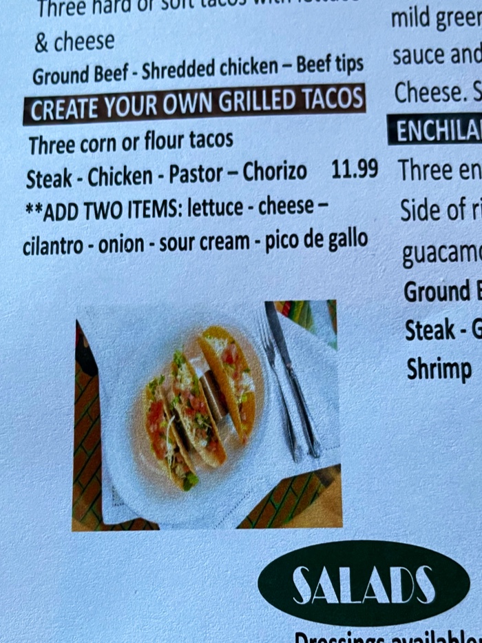 So went in with my 2 kids & my parents on a Saturday at 5pm. It was only us and one other table of 4. Ordered the “Create Your Own Grilled Tacos.” I asked for three steak tacos , 2 with lettuce & cheese and the other with cilantro & onion. This though is not allowed! You have to order all three tacos with the same toppings. I asked “really?” and “you can’t make an exception?” She would not allow this to happen. When I asked why, the waitress explained it was because the cooks need to be able to put the tacos together in a hurry. I said, “we aren’t in a hurry.” (And there were only two tables sat in the entire restaurant). My request was still a NO GO. Very odd..the restaurant isn’t a fast food restaurant (they plan to have alcohol eventually), it wasn’t lunch, we stated we weren’t in a hurry and there were no customers in the restaurant. So I’m still baffled...I guess that’s why I’m writing a review to process this trauma (joking...sort of..still joking). Other than that the restaurant was very good. The waitress was pleasant and attentive, the food was good, place was clean, good lighting (pleasantly dim lights), had sports on the TVs, had a nice kid’s menu, and they serve coke products (way better than Pepsi). I’m perplexed now on wether or not to go back. I live close and would love a good Mexican restaurant/bar that is close by. I just find it really unappealing that I’m told the cooks are throwing food together in such a quick manner..per the...