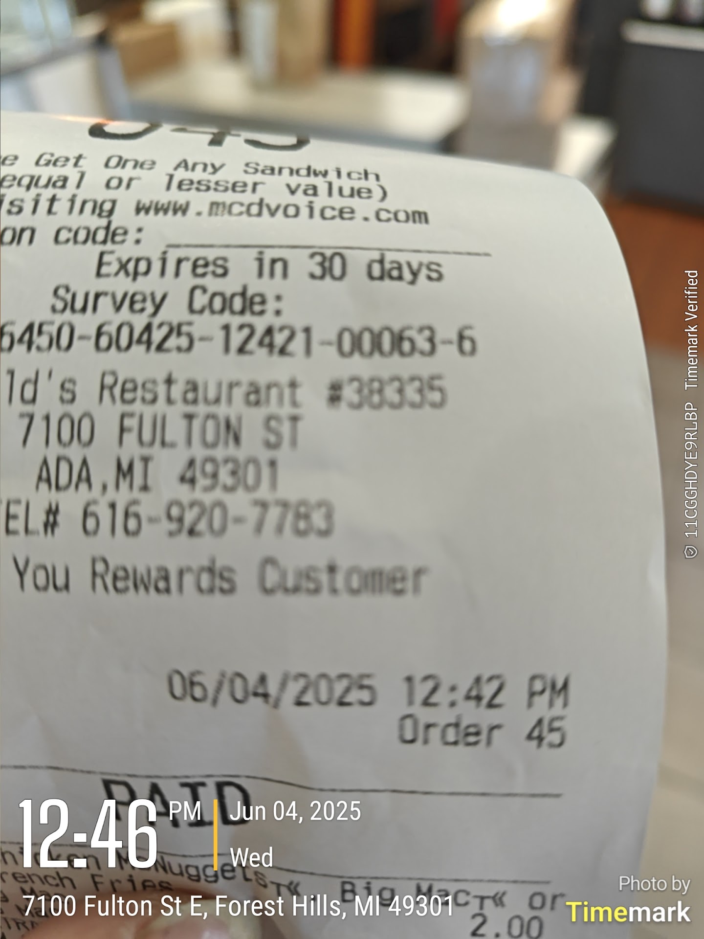 Read moreYet another McDonalds that marks your order complete IMMEDIATELY and makes you stand there 5+ minutes. AND I had to go back in when I realized that she hadn't given me my drink. You can see when I ordered and when I received my food. But the screen said my food was ready 5 minutes ago. And to top it off my Big Mac had no pickles and almost no lettuce. I order extra onions because if you don't you might find 1 or 2 of those super expensive dehydrated onions at any McDonalds if you don't. But extra anything else and they make you pay a ridiculous amount extra for. Also my fries were cold because she put them in the bag while waiting 5 minutes for my incorrect Big Mac. And the medium fry box was only about 60% full so basically a small one for medium price. Piss poor service and food quality. All in all a 1* is too generous. And I definitely won't be back to...