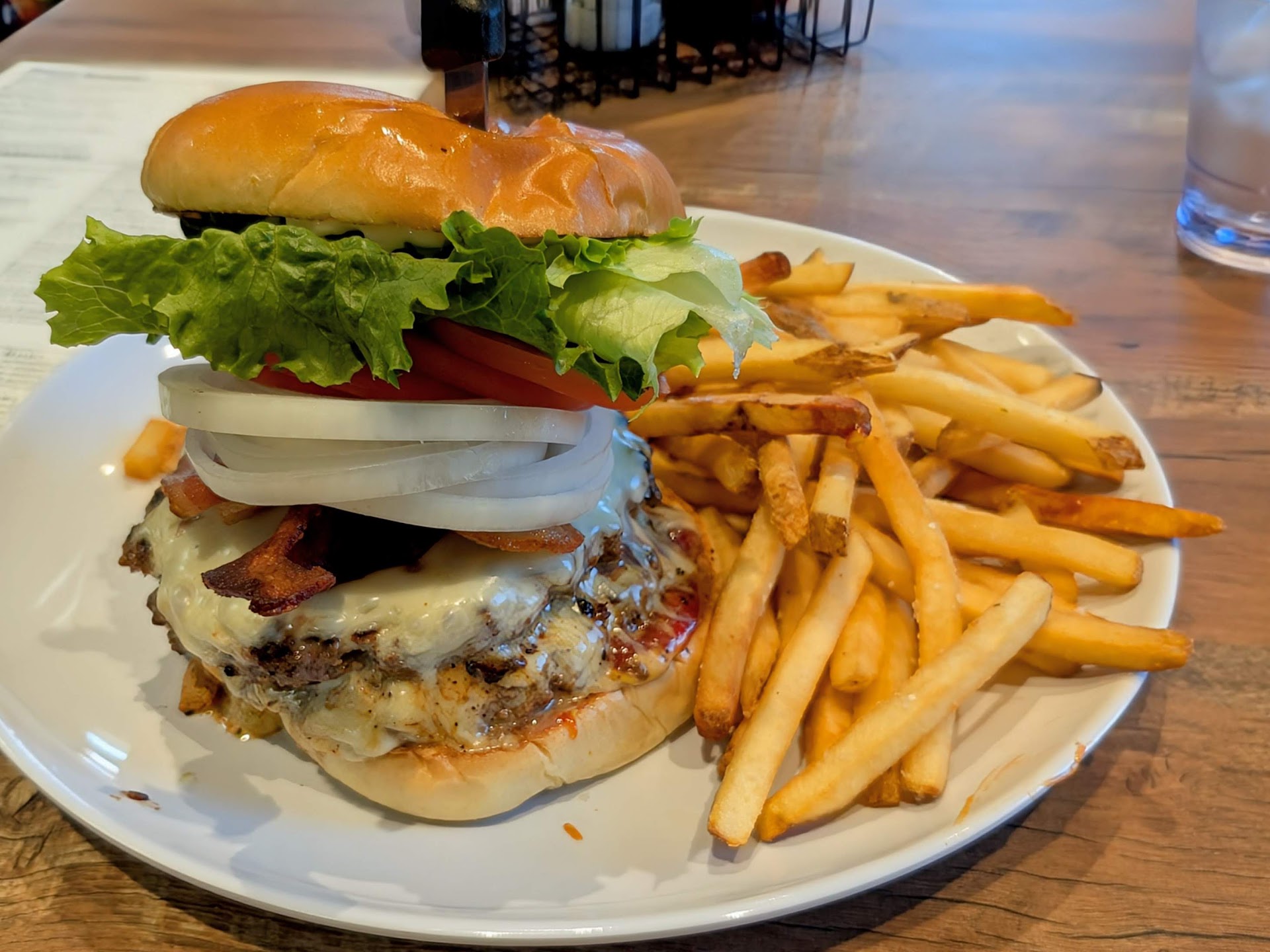 Big sloppy burger and tons of fries with a bit of a price tag.
