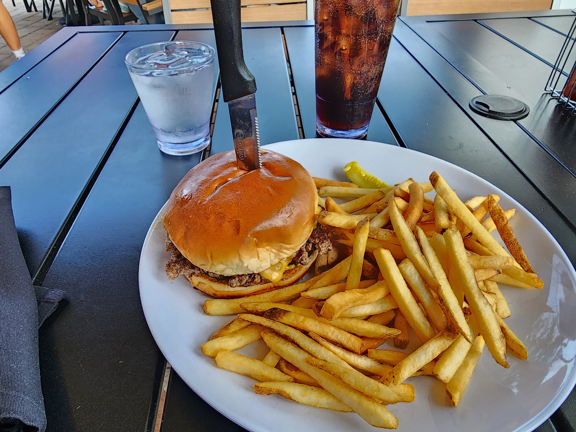 The service was lacking throughout--it took about 20 minutes (and us asking an additional time) to get waters, and one burger came out 5 minutes before the other one. We also never received napkins or silverware at any point.