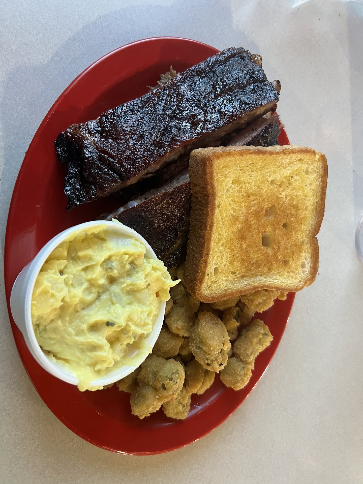 Very disappointed in this experience. When I first get there no one greets me or even acknowledges my presence. Felt stupid just standing there so I seated myself and was still being ignored while making the attempt to flag someone over. Finally got up and went to the check out counter where I was finally asked if I had been helped. Made me feel disrespected. Placed an order off there little crumbled up piece of paper menu and was surprised on how quickly my food came out. Okra was cold, chopped brisket was warm in spots cold in others. The ribs fell off the bone but the outside was tough and dry. I’m not a chef but felt it had been sitting under a heat lamp for a long while. Floors were dirty, the little napkin and sauce deals on the tables were flithy, the bbq sauce was so sweet I left feeling sick. I am all about the experience when going out to eat and the feeling that experience creates. I got here felt disrespected, ignored, unwanted and left feeling sick and disappointed. I’ll give them 2 stars because I did enjoy the potato salad. I won’t be back to this place and...