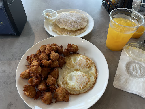 I ordered the Cowboy Breakfast: two eggs over medium, breakfast potatoes, and pancakes (you can choose between pancakes or a biscuit). All of that for under $10āan absolute steal. You can also add sides like bacon or sausage for under $4.50, if I remember correctly. I also ordered the freshly squeezed orange juice.