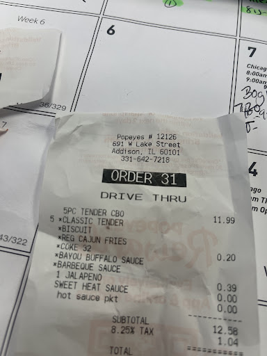 Read moreSTAY as far AWAY from this place as possible!!! Went in to order lunch for the office at work. The staff here hates life and is bother simply for doing their jobs. Instead of their uniform the girl in the front was wearing sweats and headphones, they yell at each other and complain, tried to pay cash but was told exact change only (Really?) so I had to pay with a card. I was overcharged an extra meal, refused to refund for the errors. Paid for "combo" meals, but none of the drinks worked except for diet and watery lemonade. Asked for a refund of the difference and was denied. The staff here is absolutely ghetto. The food taste horrific, like the oil has not been changed in years, the tables are extremely sticky, and floors are hideous. Ordering/receiving food takes 20-30 minutes, so much for your lunch break! It is not because they are busy, there was ONE other person there. They are just LAZY! Do your stomach and sanity a favor and find another location. I love Popeye's, every other location I have been to has been great, it is just this location. Go to Lombard, Bloomingdale, Bensenville.. it does not matter which one just don't go to the one in Addison. Can't wait for it to...