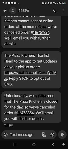 The Pizza Kitchen is a casual, family style restaurant with a limited menu of appetizers, pizza and a couple of pasta dishes. They have a full service bar with a handful of bottled or canned beer, but no beers on tap.