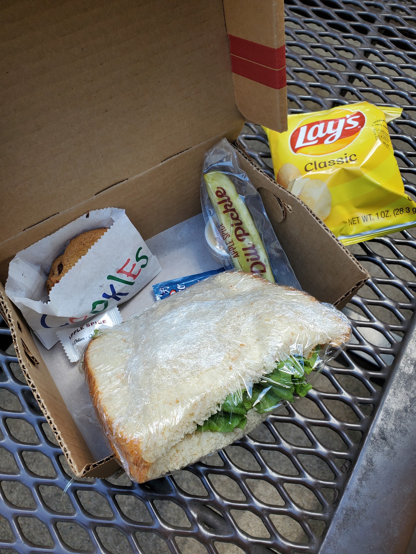 I had the turkey and Swiss on the second best wheat bread ever. (I make the best honey wheat bread.) Along with the sandwich came condiments to dress it. I used the mayonnaise and the yummy special sauce. I had some of the Lay’s potato chips, ate the pickle, the well-balanced pasta salad, and finally the cookie. The pickle was in a clever plastic bag. It was a zipped bag. I couldn’t figure out the cookie…was it a sugar cookie or one with white chips or something totally different? The extra treat was the mint. I expected it to be apple spice...