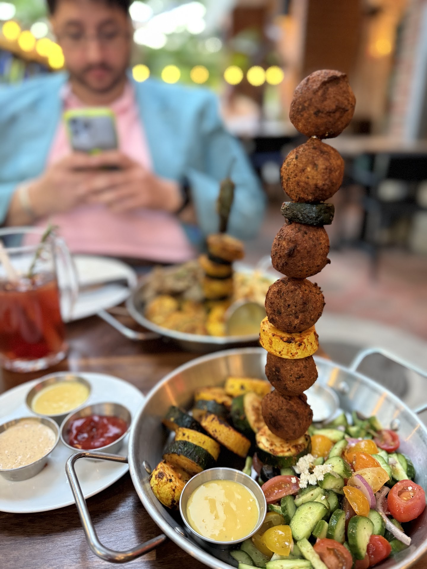 I got the falafel tower with grilled veggies and greek salad for my entree. Personally, I recommend the honey mustard that comes with the grilled veggies on the side because the veggies themselves are seasoned with paprika and the honey mustard would hide it. I loved that the veggies were not an overcooked, soggy, oily mess. They were cooked just enough to be soft but still had a bite. The greek salad was better than I expected too! Not overly salted, tangy, and a great herbaceous thyme flavor that helped to balance and ground the brightness of the dressing. It was addicting to eat. The falafels are also amazing. Not dry and crumbly but moist enough to hold together but dry enough the crust was satisfyingly crunchy. I wish I could place the flavors for you, but just know it was tasty.
