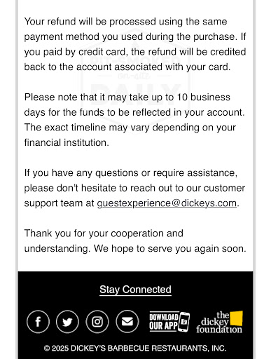 Ā Ā Ā Read moreDickey's reached out and let me know that problems related to online delivery orders have been resolved. I ordered today appetizers, a 3 meat plate, a drink and dessert. Everything was perfect, delivery was quick and my complaints are irrelevant. I can totally recommend ordering online and having it delivered.
