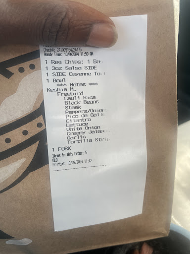 Read moreI went to this location today to pickup my order I placed online. I completed the order and I specified 12:45 for pickup time. When I got up to the counter had to wait finally a guy came over and he asked me my name he proceeded to look thru the orders and finally said, I don't show an order by that name in the system, rude and snerky he was. I was flabbergasted! He went and got the manager, I believe her name was Esther (??) , she looked at the orders as well finally she said yes we don't have that order, are you sure, it was for Freebirds and I was like yes! She looked again, finally all of her other employees came over too, all standing around with dumb stupid smirks on their faces. She tried to charge me again asked me what I ordered and I said 2 chicken tacos and she said no we don't have anything like that so I'm charge you for 3 street tacos and I was like no you won't I've already paid online you not gonna charge me double!. Just didn't like her snerky attitude, no apologies, no, I'll look into this further, just that air about her that said I couldn't be right, it had to be my fault. Sorry freebirds you probably lost a potential customer with your screwed up system and poor customer service want to see me never return to your establishment? Then that...