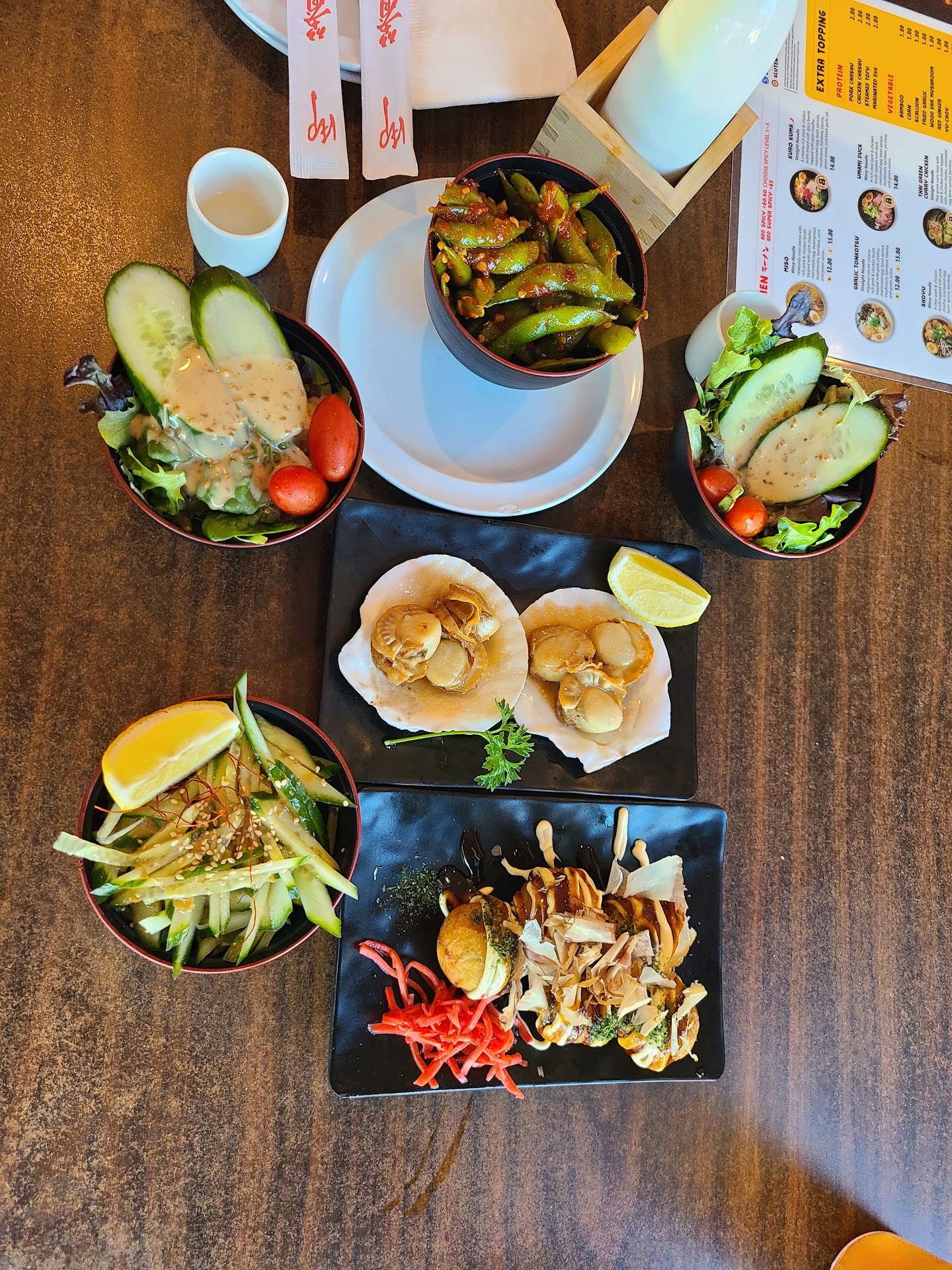 We hit the tapas hard. Mini salads, panzu butter scallops, chicken karaage, spicy edamame, cucumber salad, takoyaki, dynamite shrimp, and the kamonegi duck.