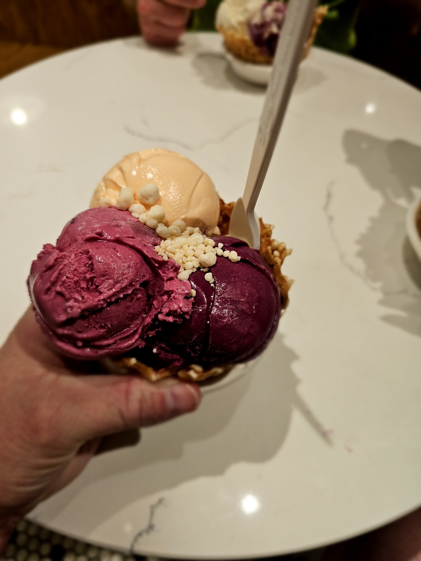 Ice cream is phenomenal but the service today was horrible. There was only 2 other customers who had eaten and were leaving because it was after 2pm so there was not a rush. I initially was requested three flavors but couldn’t pick so I settled for 2. Nothing had been scooped yet. The cashier became visibly frustrated as if I was wasting his time as I chose my flavors. I kindly asked for the waffle triangle that was offered to me the last visit, he was huffing and puffing like he was having to bake it from scratch. He brought the ice cream and stuck the spoon in one of the scoops. I asked for the lid to the bowl and he said Oh you wanted it to go? With an attitude. Then walked away shaking his head. I told him to keep it because I won’t be paying that much for ice cream to be disrespected and tolerated. I’m extremely disappointed with...