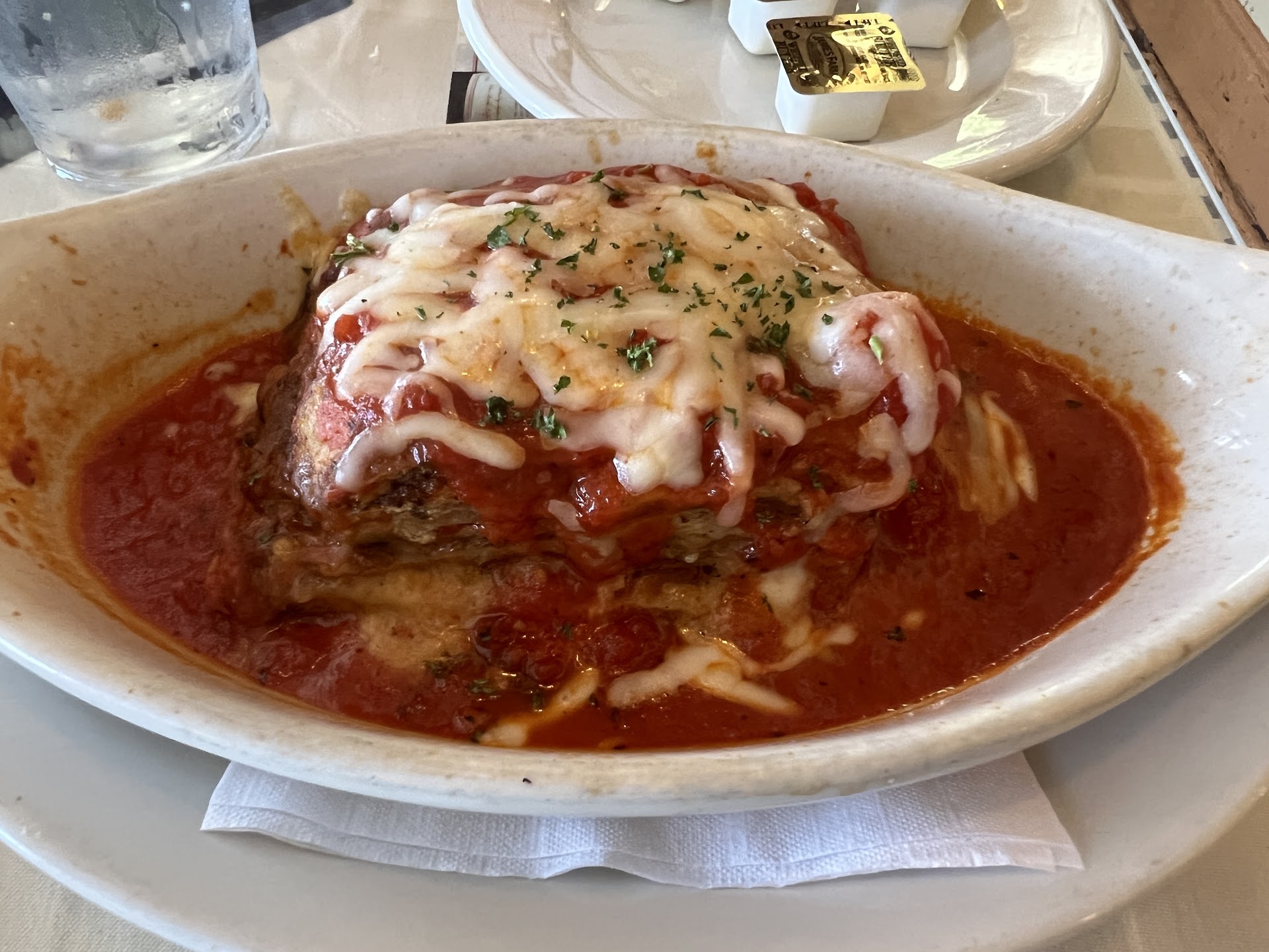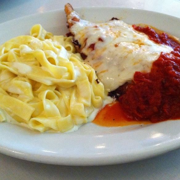 Combination Platter: 4 out of 5 burps! 1/2 Chicken Parmigiana and 1/2 Fettuccine Alfredo. Two of my favorite Italian items next to Monica Bellucci and that skinny Food Network lady that you know doesn't eat the food she makes, that skinny little... If memory serves me right, this place used to be closer to Farmers Branch. You know the "not so well off" area. Now they are in Addison which is like what, Irving to Las Colinas? I guess the cities that break off from adjacent "not so well off" cities are like the theory where you can drink to kill off the bad brain cells or something? But back to the food. Yum num is what this is! It's just the right amount of chicken to sauce and cheese ratio and the fettuccine is muy bueno! Its cooked very well and not at all overcooked or in the case of the pasta, stuck together and hard. Si, muy bueno. Get off my case, I can't spell the Italian molto boune or whatever. Somehow it always comes out Malt-O-Meal and I just don't feel like fixing Apple's crappy spellchecker! My only complaint about the food is that when they were in Farmers Branch, the same thing was about $5.99...maybe even $4.99! Oh but time changes and so does inflation so you really can't fault them for this. The other thing I like about this place is that it has that real Italian feel. You've got the Don sitting at the bar and what seems like other "family" members always walking to him and chatting it up. You don't get that at the Olive Garden...and if you do, then the Don you're looking at is like the Mayor McCheese version. Sure he's got a sash on which makes him official, but he wouldn't last in a...
