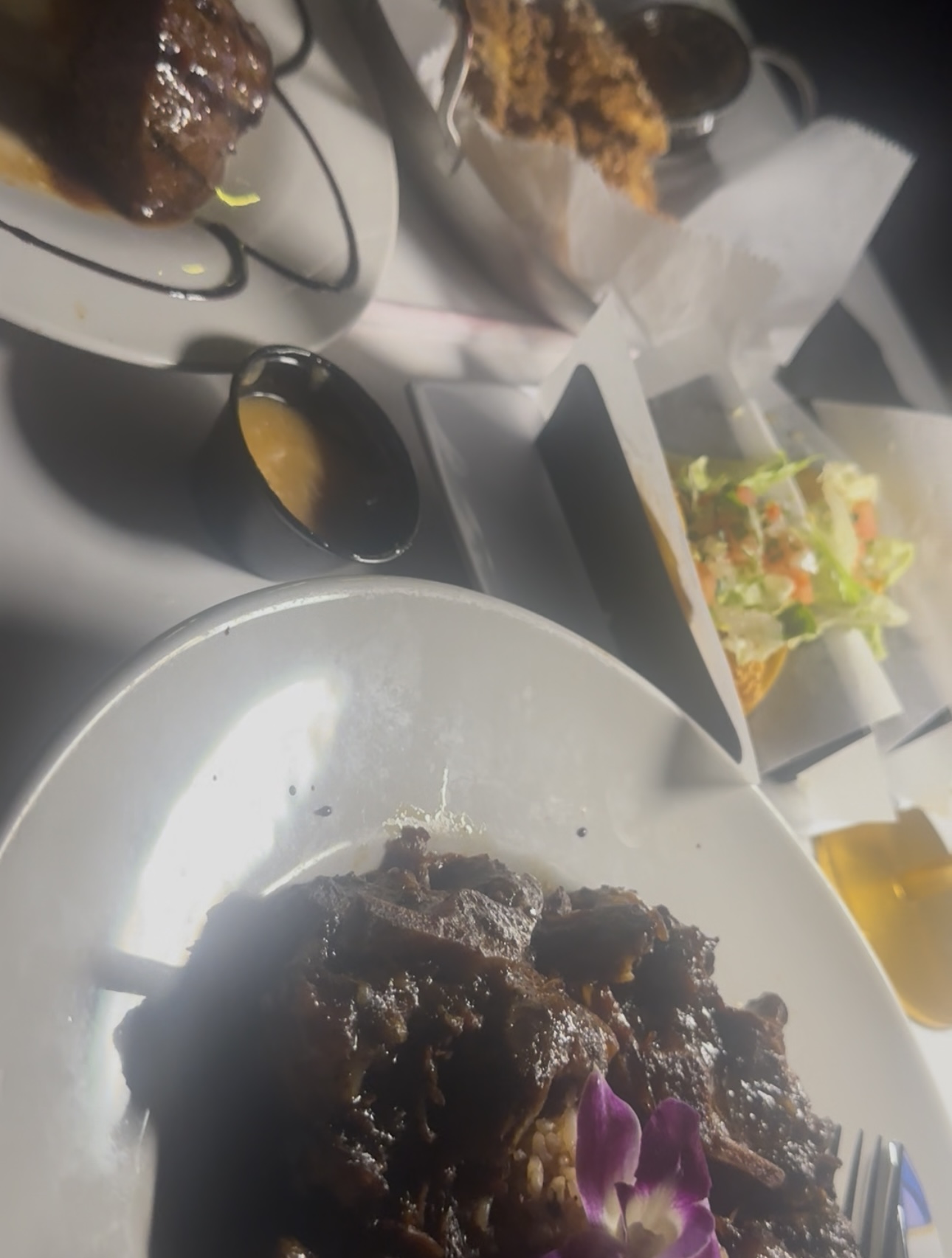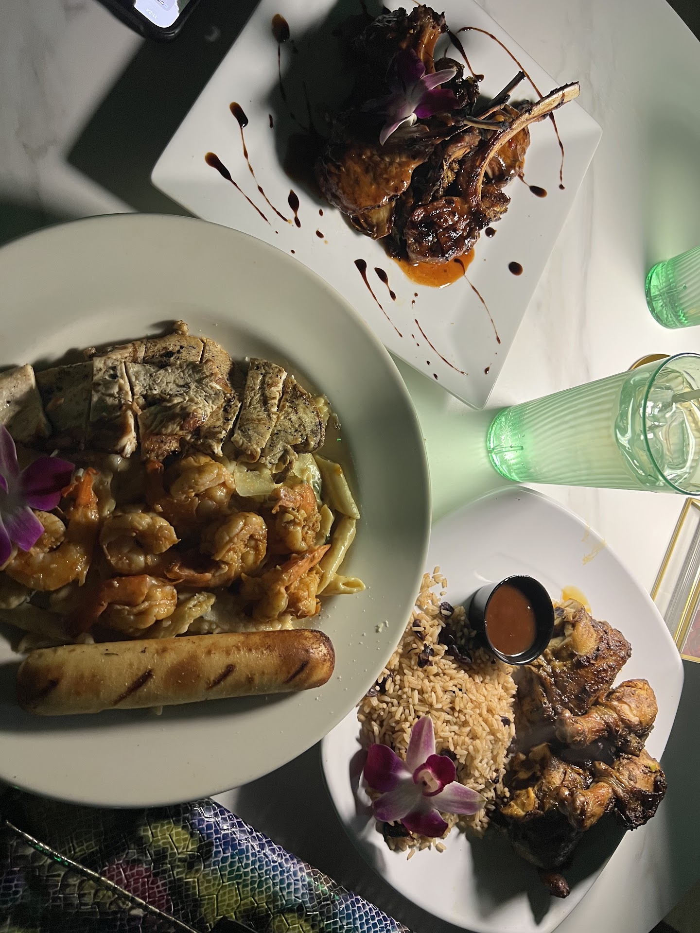 I really try to support black owned restaurants to the fullest. This spot I’ve visited more than once and it’s always a hit and a miss. My first time the music and crowd was not a match with the decor. But we stayed for the food and it was delicious. Especially the oxtails. Also our waitress was hard to locate and we noticed she was dancing at the managers table and smoking hookah. We went again recently only for the oxtails bc it’s not our vibe with the environment. So that lets you know how much we enjoyed the food. The issues began with the arrival. We were told there would be a 20 min wait, but it was well over an hour. They ran out of oxtails, we ordered several entrees and the specialty cocktail…just to enjoy the food. (Lamb chops with brussel sprouts, jerk chicken, calimari, and the pasta with both chicken and shrimp. The cocktail and water glasses had lipstick, water spots or both. When we informed the waitress she literally poured the drinks we had in clean glasses instead of making us a fresh drink in a clean glass when it costs $18 for a drink you expect it to be made as pictured and in a clean glass. While talking the bus boys kept the table clean which was great but they quickly took our unfinished side away before we noticed it and attempted to take a full cocktail l that hadn’t been touched. We asked for the owner who gave us a lot of dramatic sighs and complaints of the staff that night. He didn’t at minimum offer to make us fresh drinks nor even to replace our taken side of Brussel sprouts. We were a party of two and spent over $200 including the Now automatic 20% tip that isn’t shown anywhere! We came to truly enjoy the food, even though we didn’t care for the music the second time but the first time it was a 90s vibe. They have an amazing chef whoever he is. The staff needs to be retrained from the waitresses to the bartender to the bus boys To the host at the front Door. I would even say management as well in regards to customer service. They have such a beautiful establishment with good food, but the service is huge and in this case it’s sub par in comparison to the price and quality you should receive. I hope that they are able to re-shift and transition their customer service skills because the food being delicious is only gonna keep your crowd for so long. Getting clean glassware should be a minimal expectation. I was very disappointed and the owner not trying to rectify anything from my experience not even just putting us a fresh cocktail in a clean glass. Or replacing the brussels sprouts that we didn’t finish nothing other than come back, even after we told him this experience made it to the point where we don’t want to return.. If it’s your crowd, it’s worth going for the food if it’s not then definitely get it to go because the customer service needs a lot of work. I am really sad Because I love the oxtails but I cannot give them anymore of my money when it wasn’t appreciated. Extremely disappointed that I can’t continue to support a black owned business that has so much potential to thrive, but they aren’t working on that part of it. This is not to bash, it’s honest feed back for change. We would happily returned and spent $200 on food if we had...