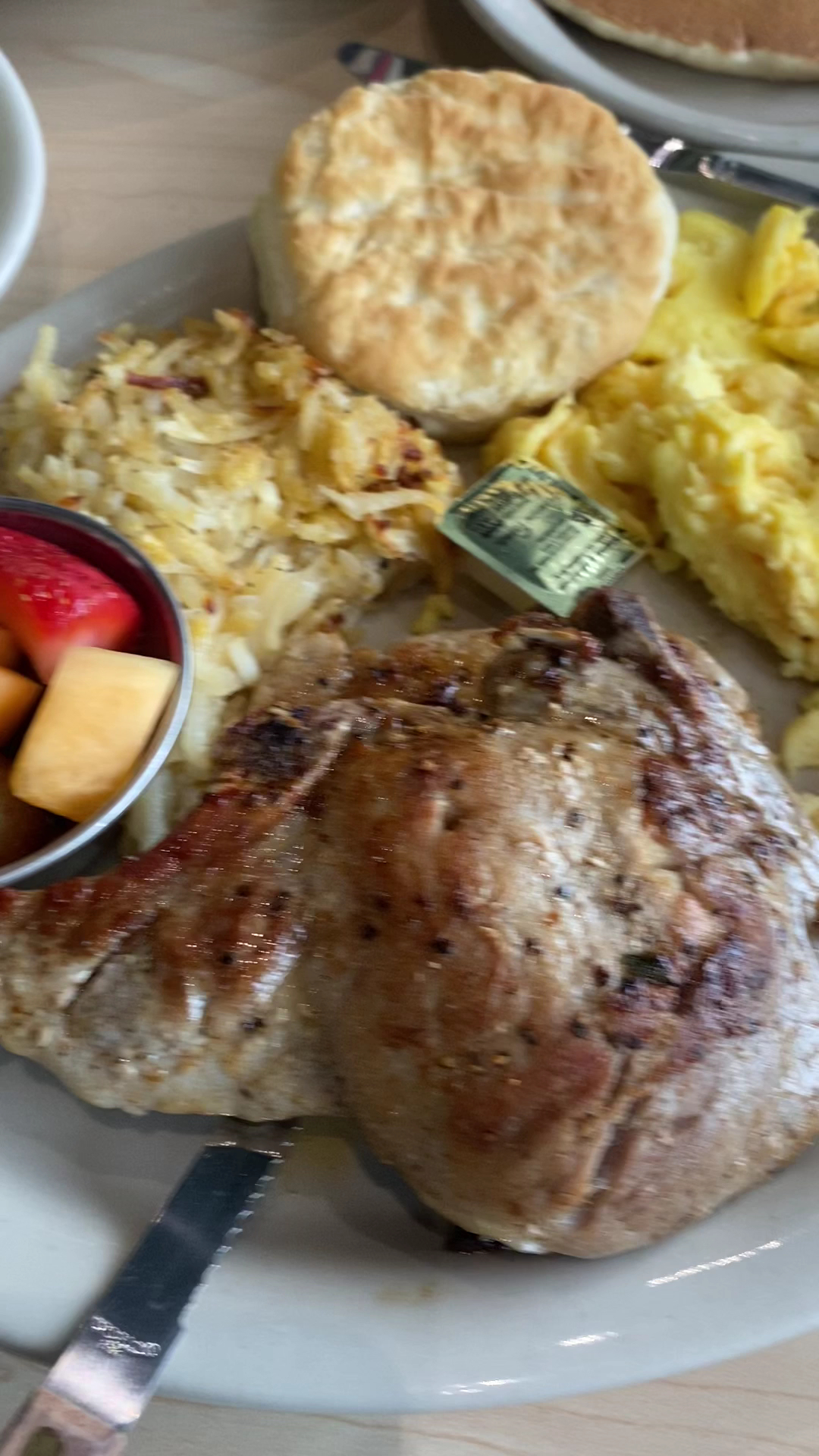 Read moreThis is a great breakfast location. Every person that we interacted with was nice and attentive. The menu is a bit massage so give you self time to browse. Our order is pictured so as you can see the portions are huge but most dishes are under $20 and there were several under $15. That pricing is on par with any good restaurant but again, the potions are much more than enough. The wait for our food was timely and everything came out fresh. The Pork Chops were seasoned just right, not overly salty but fitting and they were tender. You also get 2 but both are a nice size so I took the other home. The Alaskan Benedict which featured Salmon was also great. The Salmon was tender, not dry and married well with the Hollandaise and other ingredients on the dish. Though all dishes were truly great, the Shrimp and Grits would have to be number one. They were creamy and savory with flavor throughout the grits. You could just eat the grits. The pancake, which is also massage had a really great taste as well. Overall this was an amazing choice being our 1st time and we will definitely return and invite others. I highly recommend this place. Oh, and my custom Margarita (No OJ) was awesome too. I only had 1 and I’m a drinker. One was...