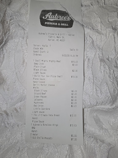 Read moreI try not to leave bad reviews but this has to be said. This is the second time we tried Aubree's, the first time we weren't impressed either, but I always try something twice and really couldn't really remember specifics as to why, just that we weren't. We decided to eat there before their trunk or treat (which i was disappointed in, kind of a waste of time due to low participants but thats not their fault) yesterday and bc they were donating to our kids school, win-win. I ordered the open face roast beef sandwhich and what I got was a piece of toast with a can of beef slop on top. Like it was very clearly out of a can, I can buy the same thing at walmart. It honestly looked like wet dog food and tasted even worse. My SO got the caijun pasta and he said it had absolutely no flavor. We sent both back and didnt order anything else. What i can say is their french fries were amzing and the persinal pizzas my kids got were really good too. The food also took forever to come out. Our waitress was kind, but we hardly seen her and it wasnt busy at all in the restaurant (maybe busy with kids day and the trunk or treat idk). And I would also like to mention that any time I've ever sent food back (which rarely happens) and being 2 meals, without wanting replacements at that (which has actually never happened) a manager ALWAYS comes out to apologize or something. But no one did. I might go back for their pizza for one more try, but I'm definitely never ordering other food there again. I wish I could post the picture of my food with this
