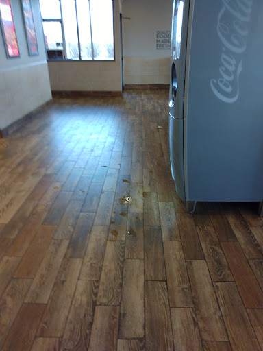 As you look at the picture of the floor included, that was from an employee getting soda and spilling it...this was take almost 15 minutes after she spilt it as I was getting ready to leave. Noticed the sign was missing Wendy, not sure where she blew off to but maybe she was embarrassed by the food being served at this location. As a side note, I asked for my fries to be substituted like at another location owned by the same company, but I was told no so that is why I ended up with the fries...which ended up being tossed as they were cold and not crispy.